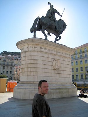 | Staying in Baixa, we visit Praca da Figueira. It sounds quite grandiose, but it actually means Square of the Fig tree’s)unoriginally a hospital, it was demolished after the earthquake and used as an open market.Sadly there’s no market there now, just coffee shops and the usual social fayre.In this picture, you can see a statue King John I a noble knight born in 1357 (although the statue was actually put up in 1971)